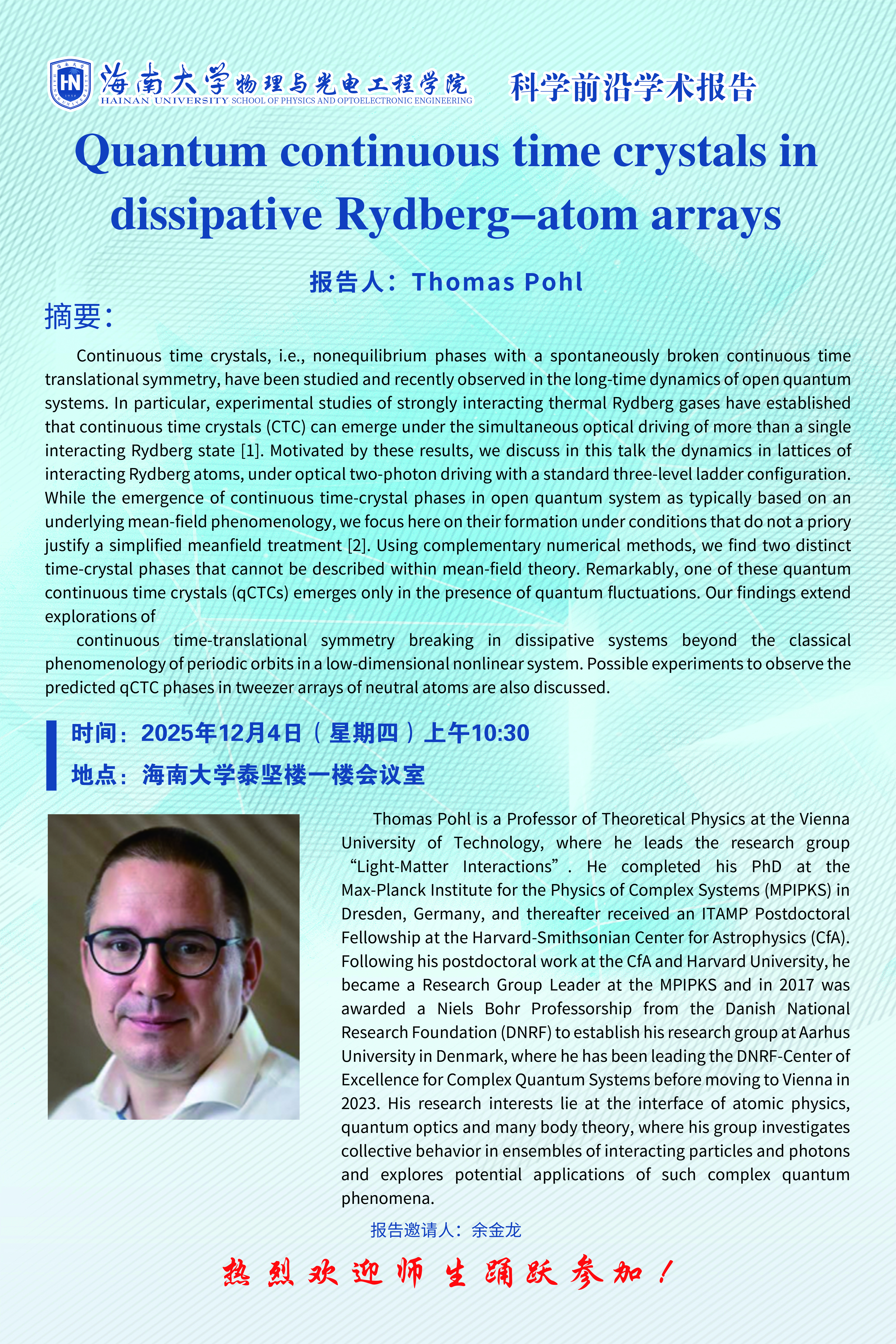 科学前沿学术报告(七十三):Quantum continuous time crystals in dissipative Rydberg-atom arrays